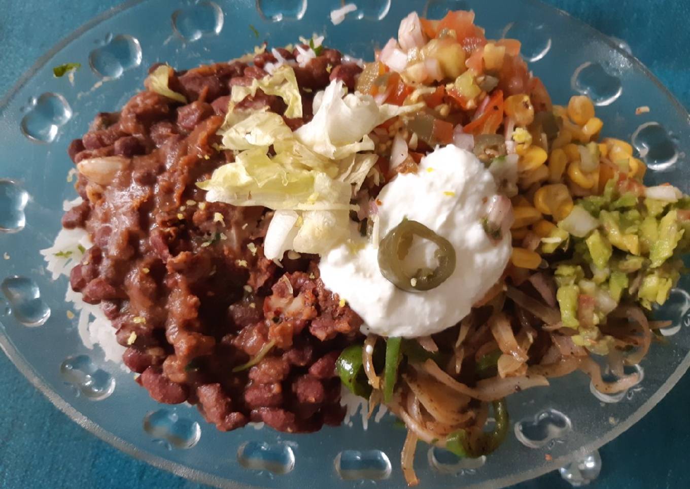 - Now arrange 🌯 bowl. First make a layer of rice and keep both salsa, sour cream, fajita, refried beans and lettuce.