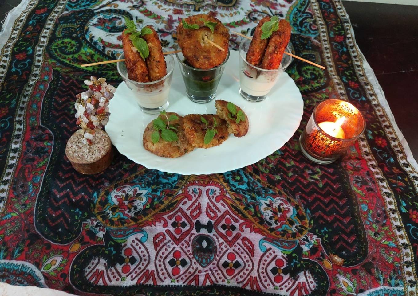 - Take a dish and arrange chattny glass and sweet curd glass and arrange swek stick wadas garnish mint leaves/ ready to serve