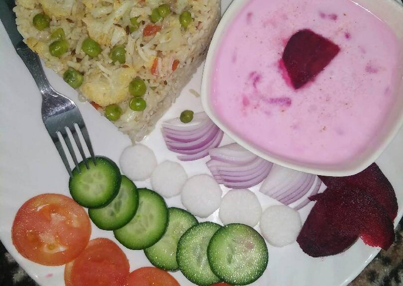 - Ready hai tasty vegetable pulao and beetroot raita.enjoyyyy