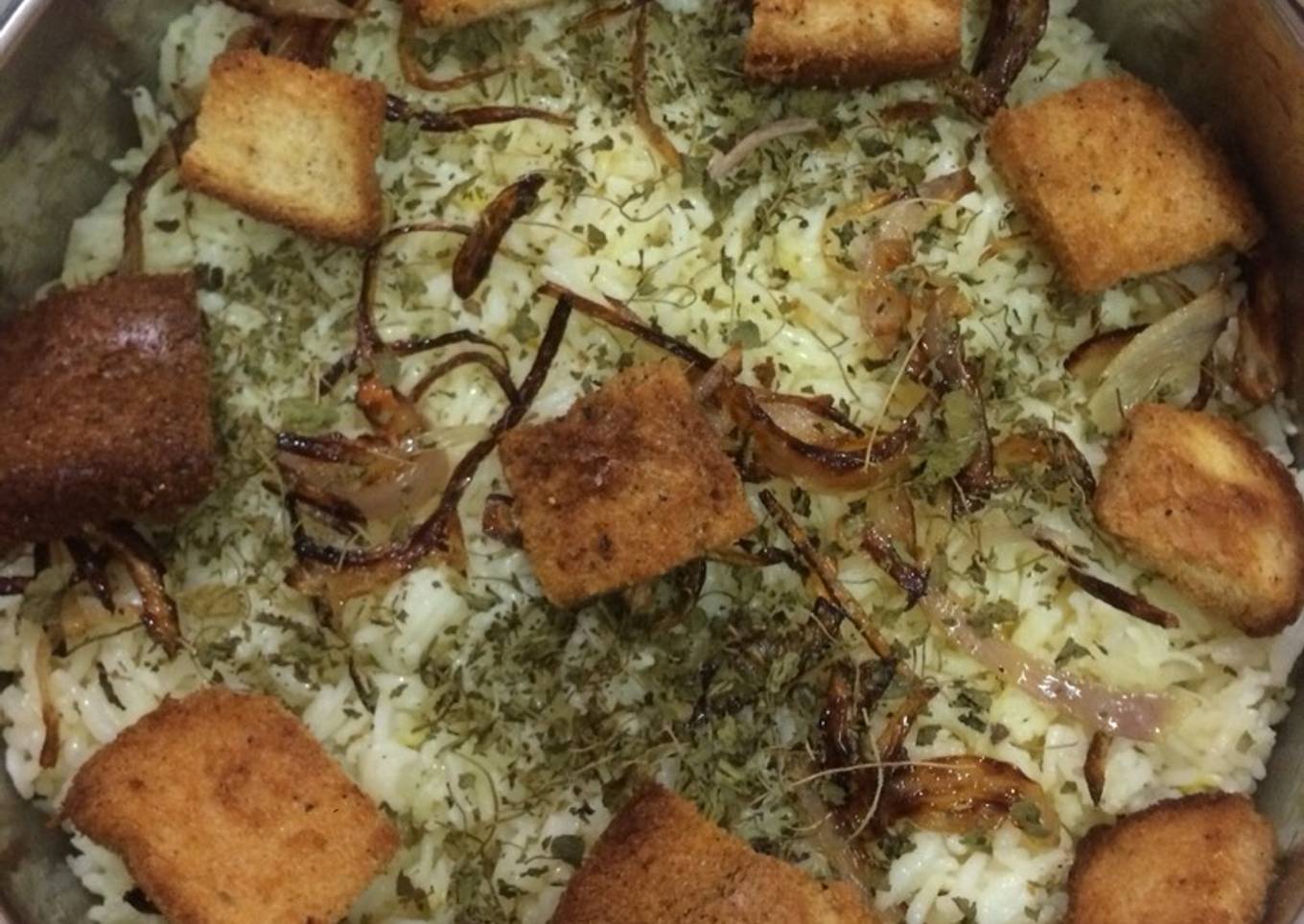 - Layering the saffron vegetable pulao. First add the cooked vegetable then add the basmati rice and then caramelized onions then croutons then Kasuri methi and serve with onion raita.